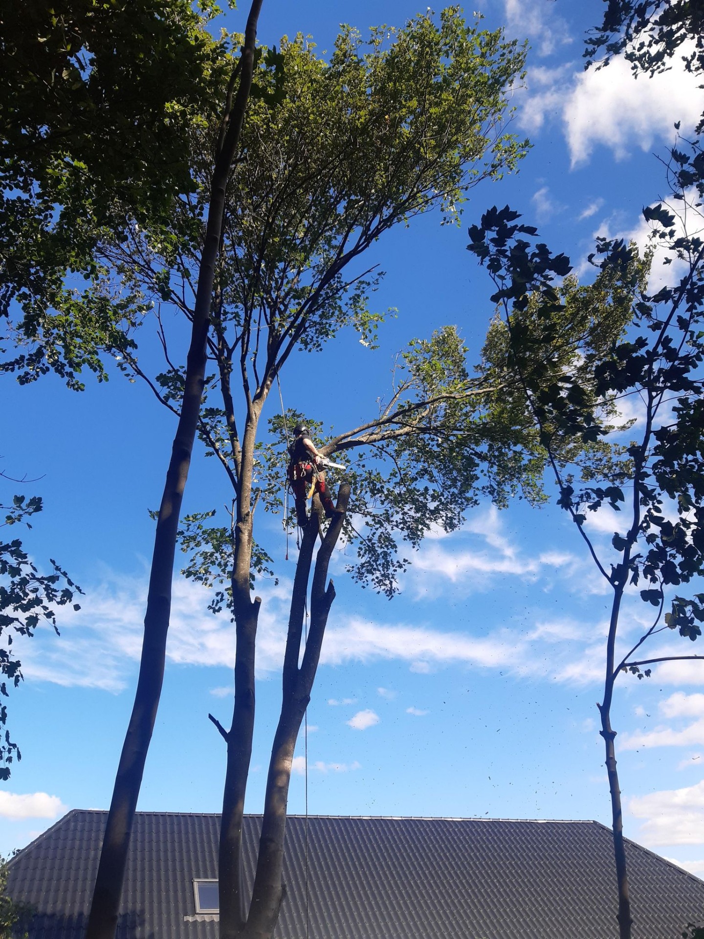 Står træet tæt på bygninger, veje eller følsom beplantning, klatres der sikkert op i træet, som fældes kontrolleret i sektioner. Grene og stammer nedsænkes sikkert med hjælp fra en erfaren mand på jorden, så omgivelserne altid beskyttes mest muligt.